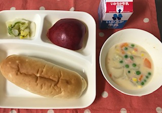 今日のこんだて【おさつパン、コーンクリームシチュー[米粉]、はくさいのピクルス、りんご、牛乳】「コーンクリームシチュー」は、小麦アレルギーのある児童生徒も食べられるように、上新粉を使ってとろみをつけています。スイートコーン(クリーム缶)、コーンの他に、鶏肉、ベーコン、じゃがいも、たまねぎ、にんじん、グリンピースを使っています。。