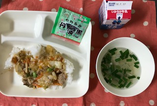 今日のこんだて【ピリ辛丼、中華スープ、ソフト黒豆、牛乳】