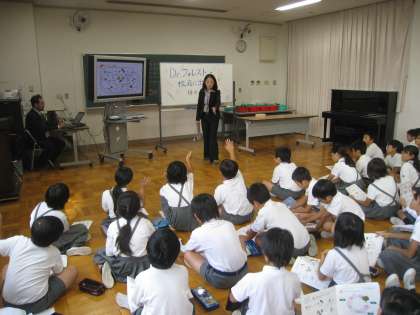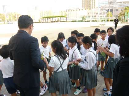 緑の専門家をゲストティーチャーに招き、緑と生き物の関わりについて考える学習をしました。多目的室で生態系について学んだ後、校庭に出てフィールドワークを行いました。