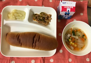 今日のこんだて【黒糖パン、豚肉と野菜のケチャップソテー、スープ、スイートポテト、牛乳】