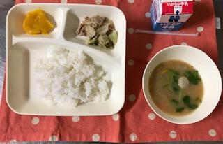 今日のこんだて【米飯、豚肉とまいたけのいためもの、つみれ汁、かぼちゃういろう、牛乳】