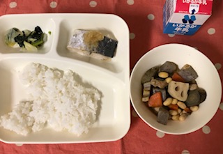 今日のこんだて【米飯、さごしのおろしじょうゆかけ、五目豆、こまつなとはくさいの甘酢あえ、牛乳】