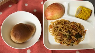 今日のこんだて【国頭パン、きのこのスパゲッティ、焼きとうもろこし、りんご、牛乳】