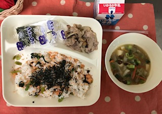今日のこんだて【さけとこまつなのご飯、豚肉とれんこんの甘辛焼き、冬野菜のみそ汁、牛乳】