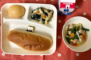 今日のこんだて【コッペパン、バター、スープ煮、ほうれんそうのグラタン、白桃(缶)、牛乳】