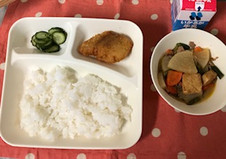 今日のこんだて【米飯、たらのフライ、豚肉とあつあげの煮もの、あっさりきゅうり、牛乳】