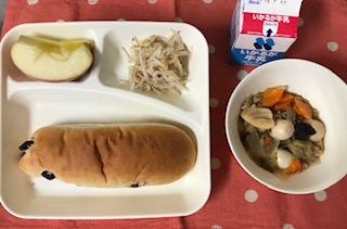 今日のこんだて【レーズンパン、八宝菜、もやしごま酢あえ、りんご】