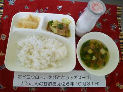 「えびととうふのスープ」は、食物アレルギーのある児童にえびを除去したものを用意し、食べられるように配慮しています。