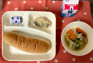 今日のこんだて【ライむぎパン、あじのレモンマリネ、てぼ豆のスープ煮、固形チーズ、牛乳】