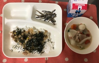 今日のこんだて【れんこんのちらしずし、ぞう煮、ごまめ、牛乳】