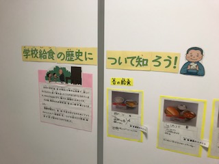 ろうかには、給食委員会で作成した学校給食の歴史や昔の給食献立について掲示をしています。