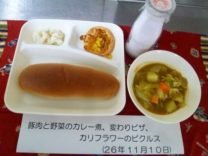 子どもたちに大人気のカレーと、変わりピザの両方が出ました。カレーには、キャベツや豚肉、にんじんなどが入り、ピザはギョウザの皮の上にチーズ、ツナ、ピーマン、コーンなどの具をのせてオーブンで焼いたものです。パリパリとした皮の食感と、とろりとしたチーズのハーモニーが最高でした。旬のカリフラワーはさっぱりとしておいしかったです。