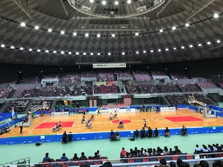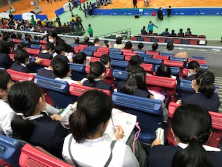 国際親善車いすバスケットボール大会に行ってきました。競技用の車いすの特徴や選手の様子をしっかりと見て、ワークシートに書きました。そして、日本対イギリスの女子代表の応援を頑張りました。