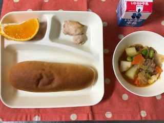今日のこんだて【コッペパン、ブルーベリージャム、鶏肉のガーリック風味焼き、豚肉と野菜のケチャップ煮、デコポン】