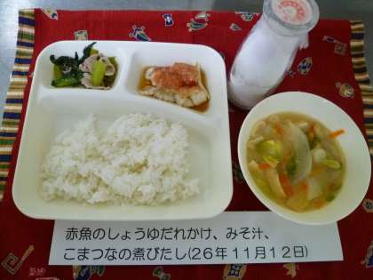 赤魚のしょうゆだれかけは、焼いた赤魚がきれいな色で、白身のあっさりとした味が意外に今の子どもたちに人気があり、「好きな思い出の献立」の上位にランクインしています。ビタミンたっぷりの小松菜は、豚肉を加えて煮びたしにし、肉のうま味で食べやすくなっていました。汁物にはさといも、うすあげ、にんじんなど多くの具材が入り、調理員さんは下処理に追われましたが、栄養満点のみそ汁に仕上がっていました。