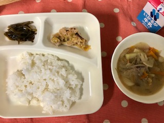 今日のこんだて【米飯、まぐろの甘辛焼き、豚汁、茎わかめのつくだ煮、牛乳】