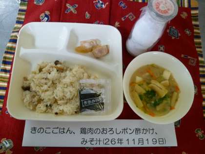 学校給食献立コンクールの受賞作品です。きのこご飯には、しめじ、エリンギ、えのきたけが入っていました。きのこのうまみがたっぷり出ていて、季節感のある混ぜご飯でした。大きめにカットした鶏肉を焼き、おろしポン酢をかけたメインのおかずは、あっさりと食べやすく、上品な味わいでした。