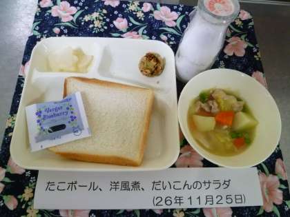 なにわ名物「たこ焼き」をイメージしたこんだて、「たこボール」が出ました。生地には卵を入れずに作っているので、卵アレルギーの児童も食べることができました。とうふや青のりの入った生地に、たこを混ぜ込んで油で揚げています。手作りした甘めのソースをかけていただきます。さっぱりとしただいこんのサラダもさわやかでおいしかったです。