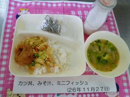 カツ丼は、一人1個当てトンカツがついています。脂質の量を計算して献立が立てられています。明日は創立10周年記念式典のため、給食はありません。12月からは、お米が新米になります。お楽しみに!