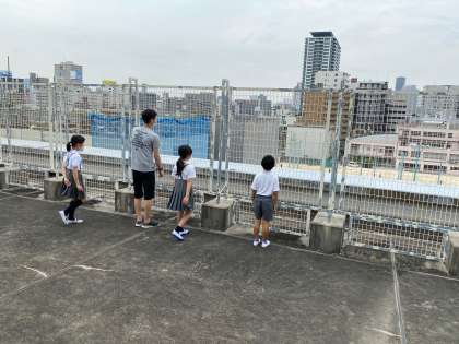 6月からの学校再開に向けて、学校の屋上から、学校のまわりの様子を確かめました。