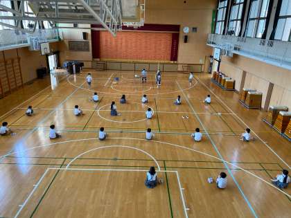 いつもの保健室と違って、講堂で、十分な間隔を空けて行いました。