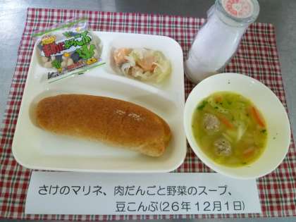 さけのマリネは、揚げたサケとマリネ酢がよく合っていてさっぱりと食べられました。肉だんごのスープには、キャベツや押し麦も入っていて、ボリュームがありました。パンはライ麦パンでした。豆こんぶもついて、食物せんいがたっぷりのメニューでした。