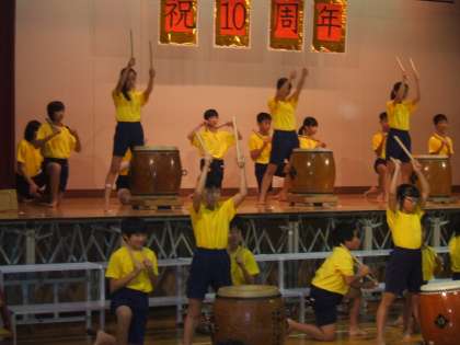今年は創立10周年だったこともあり、特別に6年生が太鼓演奏「ぶちあわせ太鼓」を披露しました。