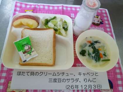 クリームシチューには、旬のほうれん草がたっぷり入っていました。ホタテ貝も入り、手作りのルウでコクととろみが増し、絶品でした。サラダには、三度豆やキャベツがたっぷり入って、しっかり野菜がとれるこんだてでした。乳製品やホタテ貝のアレルギーがある児童には、除去食が提供されました。