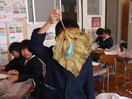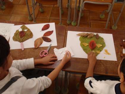 おちばを ひろい、きょうしつで いろいろな かざりを つくりました。