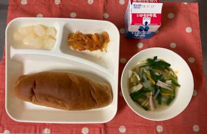 今日のこんだて【黒糖パン、えびのチリソース、中華スープ、和なし(かんづめ)、牛乳】