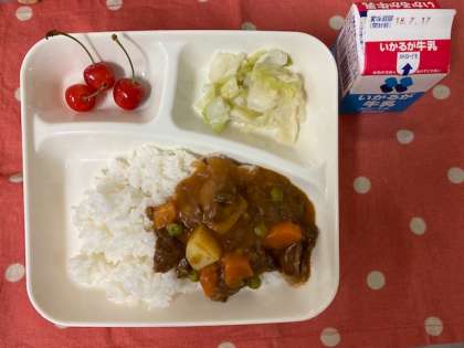 今日のこんだて【ハヤシライス、キャベツのゆずドレッシング、さくらんぼ、牛乳】
