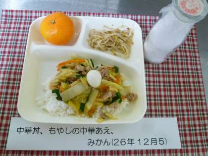 今日は中華どんぶりでした。もやしの中華和えは、ごま油の風味がよく、食べやすかったです。みかんは熊本産で大きめでとても甘かったです。