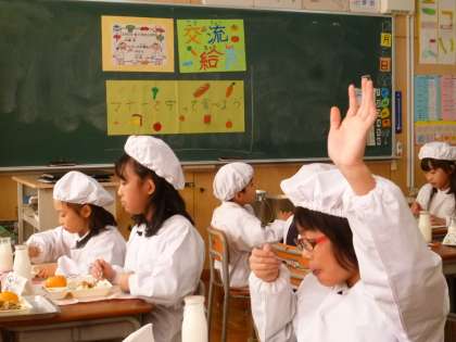 1年生と4年生の児童が、交流給食で一緒に食べました。職員室の先生方や、管理作業員さんも招いて会食しました。食事のマナーを守って仲よく食べ、食後の昼休みに1年生と4年生で一緒に楽しく遊んだクラスもありました。