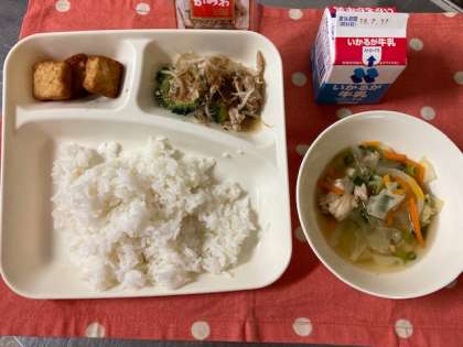 今日のこんだて【ご版、ゴーヤチャンプルー、すまし汁、あつあげのしょうがじょうゆかけ、牛乳】