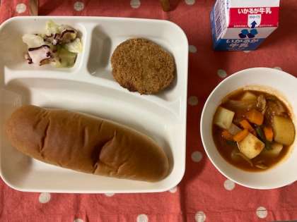 今日のこんだて【黒糖パン、チキンレバーカツ、ケチャップ煮、たことキャベツのバジルソース、牛乳」