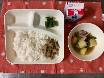 今日のこんだて【ご飯、豚肉とじゃがいもの煮もの、オクラの梅風味、ツナっ葉いため、牛乳】