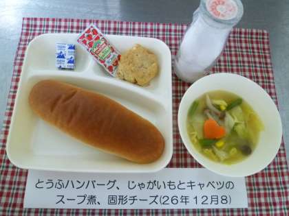 とうふやツナ、たまねぎなどを合わせて丸め、焼いたやわらかくておいしいハンバーグが出ました。スープ煮には、ハートの形に抜いたラッキー人参が入っていました。