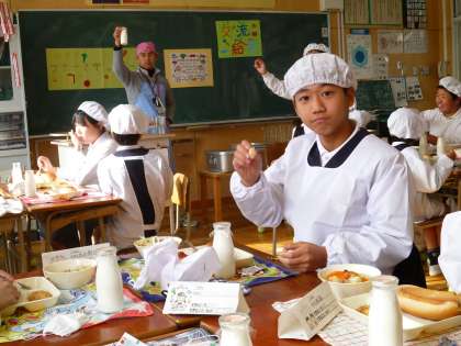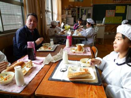 3年生と6年生が一緒に給食を食べました。校長先生や教頭先生なども招いて楽しく会食をしました。いつもと違うメンバーで食べるのは新鮮なようで、とてもマナーよく食べていました。