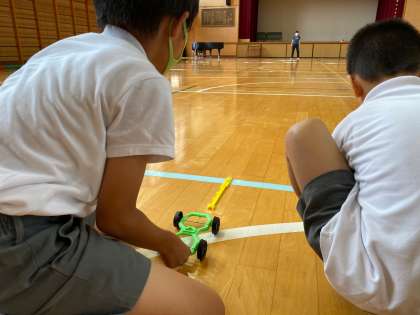 講堂を使って、ゴムをのばす長さとものを動かす力の関係について、楽しみながら学ぶことができました。