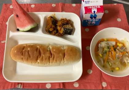 今日のこんだて【おさつパン、かぼちゃのミートグラタン、スープ、すいか、牛乳】