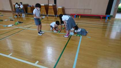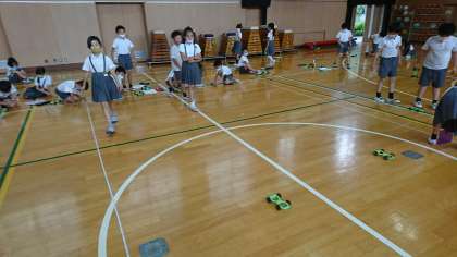 理科の学習で、風とゴムの力の実験を講堂で行いました。