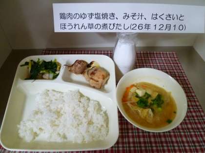 和風のメニューは、鶏肉をたまねぎや調味料とともにゆずの風味をきかせて焼いたメインのおかずと、野菜の料理、みそ汁でした。
