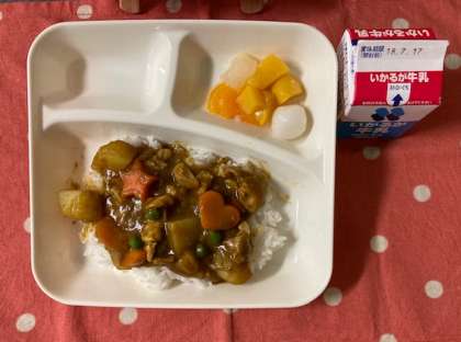 今日のこんだて【チキンカレーライス、フルーツ白玉、牛乳】