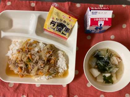 今日のこんだて【豚丼、すまし汁、いり黒豆、牛乳】
