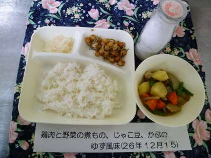 煮物には、ごぼうや三度豆が入って、ヘルシーでした。じゃこ豆は、河内地方に伝わる料理で、揚げた大豆に調味料やちりめんじゃこを合わせています。ごはんがすすむと児童に大好評です。旬のかぶは、ゆずの風味が上品でおいしくいただきました。