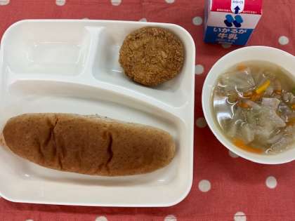 今日のこんだて【ライ麦パン、チキンレバーカツ、スープ、牛乳】