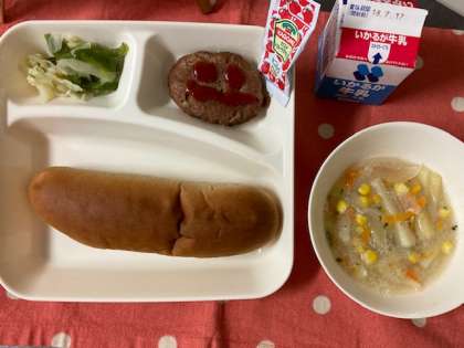 今日のこんだて【黒糖パン、焼きハンバーグ、豆乳スープ、キャベツとビーマンのソテー、牛乳】