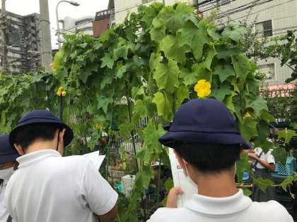 ヘチマ・ひょうたんの観察をしました。みんなの背よりも高くなっていて、ヘチマは花が咲いていました。ヘチマ・ひょうたんのそれぞれの花の色は覚えているかな?