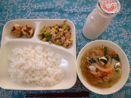 揚げシューマイは、皮がパリパリ、中は肉のうま味がたっぷりで、おいしかったです。とうふをたっぷり使ったヘルシーなスープと、ツナとチンゲン菜の炒め物が組み合わされ、栄養満点でした。今日から3日間、個人懇談会のため、B校時になりますので、12時に給食開始です。明日はコッペパンときのこのドリアの献立です。