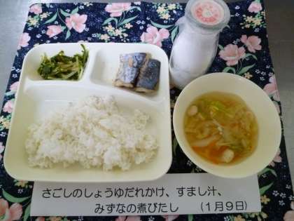 今日の献立には、和歌山産のみずなを使った煮びたしが出ました。だし昆布、けずりぶしでとっただしの香り良いすまし汁には、かわいらしい白玉ふが入っていました。出世魚のさごしも正月らしいですね。
